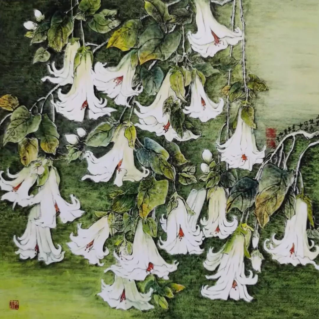前几年,我去台湾采风,在阿里山一处森林公园的山林深处,一条干涸的小溪旁,看到几株曼陀罗树挂满了黄色的大大的喇叭形状的曼陀罗花,奇异而美艳。此前,我曾在书本上见过白色的曼陀罗花。而这次亲眼看见,格外激动。曼陀罗花一向被赋予了神秘的色彩,并隐含无尽思念之语;但在中国的花语中,它却象征着纯洁和美丽。返京后,我欣然创作了三幅以曼陀罗花为题材的作品,以表达心中美好的愿望;早日结束两岸同胞隔海相望的思念之情,实现祖国完全统一,共创美好未来。