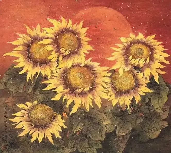 记得年少时,老家后院的乱石丛中常见几株弱小的向日葵。在冬日里,它们寒风中摇曳、挣扎;而夏季的向日葵则会结出灿灿的花盘,后院便有了生机。之后在去东北的旅途中,偶见一望无际的向日葵田在蓝天下金光闪耀、气势恢弘。这一幕成为我脑海里抹不去的记忆。进入画坛后,向日葵便为我铺上了一条通向中国画殿堂的道路。