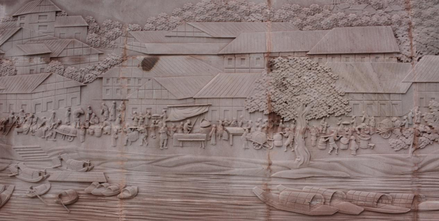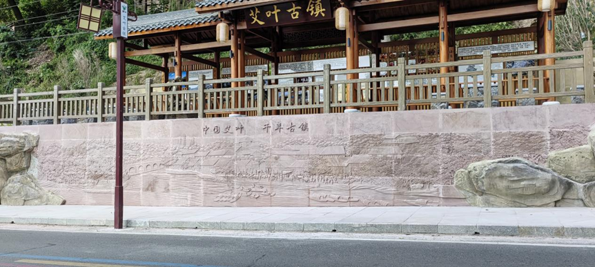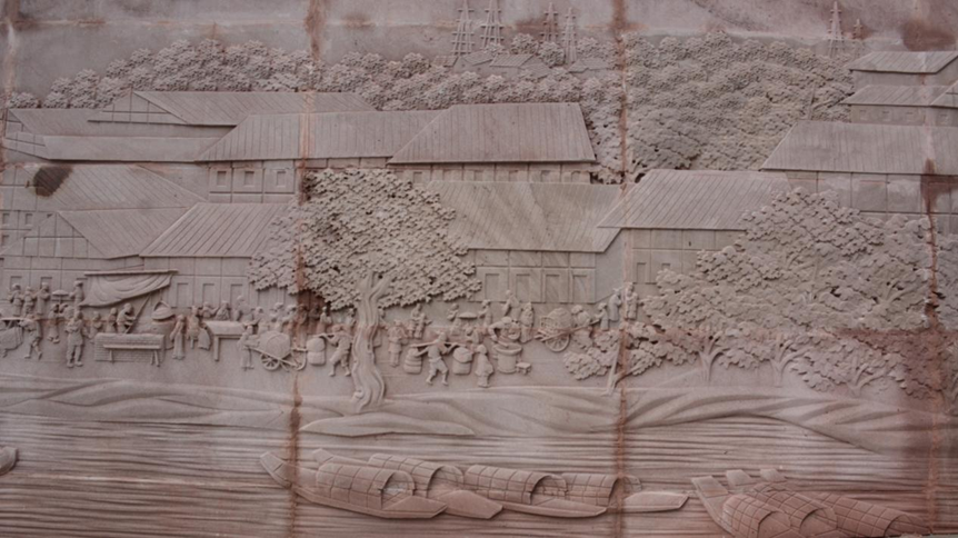 千年井盐史的贡井区艾叶古镇也借此时机,对濒临腐朽的古镇建筑和街道进行维修保护,着力改造古盐历史文化,完善其自然风貌特征。环境艺术家的何林,也是雕塑家,被邀请加入到此项修复改造工程中,他以再现明清时期古镇因盐而兴的繁华市景,茂林修竹掩映的明清建筑集群,井盐天车林立的盛世景象,世界非遗地质特点,通过简笔速写的手法,以平面构成的装饰表现形式,做减法的浅浮雕,将艾叶古镇表现在长卷画幅之上,以修饰手法再现自贡盐工强壮的肌健,反映明清时期自贡人因盐而兴的生活面貌。