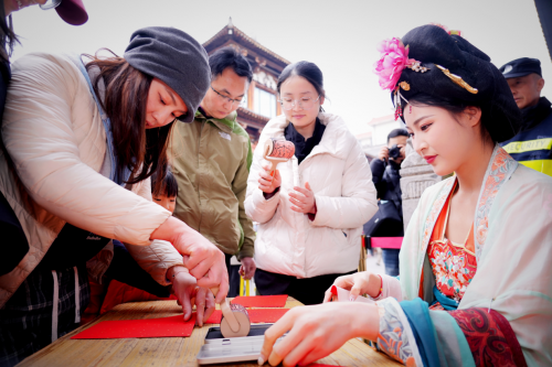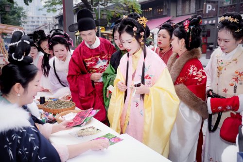 活动首日便突破单一展演模式,以汉服为纽带构建“穿、购、娱、食”全链条消费生态。现场设置的拓印制作教学,不少游客参与其中,感受传统技艺的温度;街区内汉服妆造馆、新中式茶饮店、文创商铺等商家同步联动,推出特色主题服务——妆造馆打造专属节日造型,茶饮店限定国风套餐,文创店上新汉服周边好物,全方位满足游客“穿、娱、食、购”多元需求;同时推出的“汉服+”消费激励措施备受关注,游客在活动期间可享街区内多家餐饮、零售商家折扣,进一步带动商户客流与营收增长,激活古街消费活力。