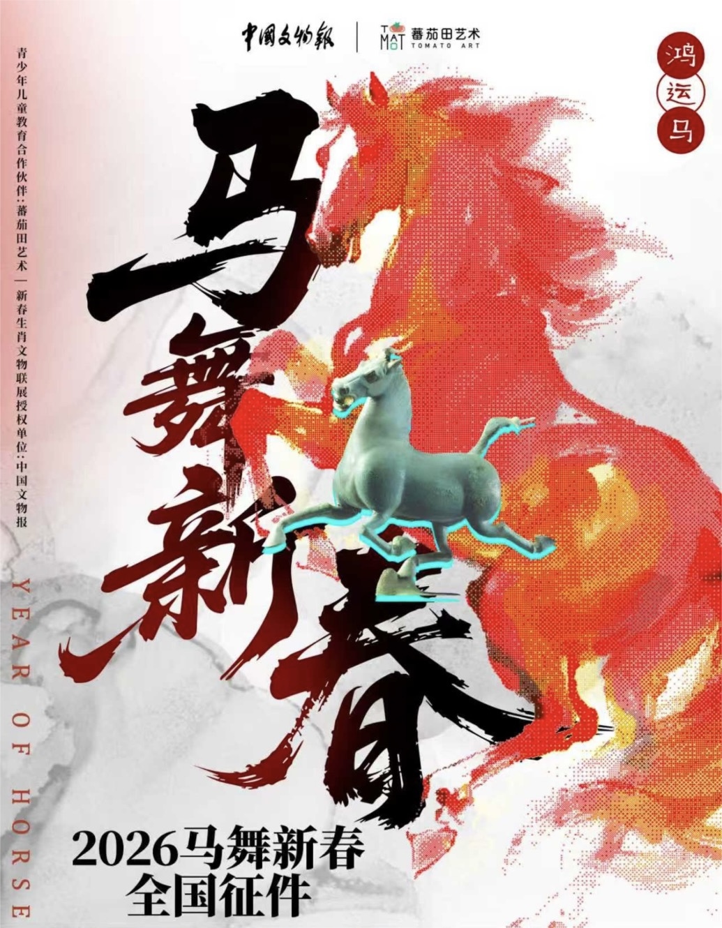 近日,蕃茄田艺术与中国文物报联合宣布,正式启动“2026丙午马年生肖文物联展儿童艺术作品征集”活动。这是双方连续第六年共同举办生肖主题艺术创作与展览项目,也是“十二年之约”文化传承计划的第六站。本届活动以“马舞新春”为主题,面向全国儿童征集关于马的艺术创作,并首次增设“AI生肖绘画”与“特殊需求儿童创作”类目,推动科技与人文、包容与创意的深度融合。