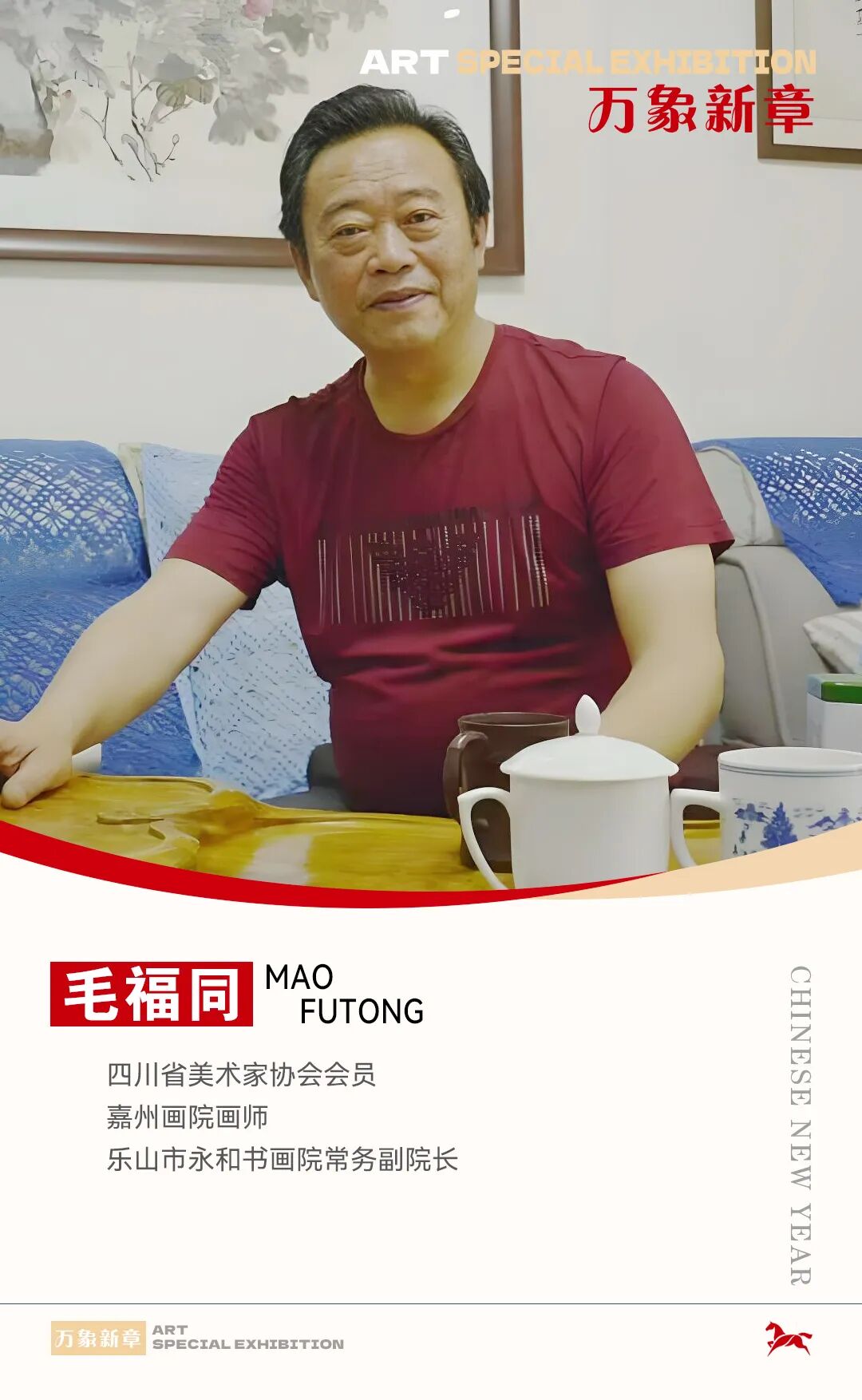 毛福同1954年四川乐山市人,四川省美术家协会会员,嘉州画院画师,乐山市永和书画院常务副院长。师从乐山著名书画家毛明祥先生。毛明祥书画工作室专职画家,作品以农村风情,瓜果蔬菜花卉翎毛工笔,小写意世人,在省市国内外展出 获奖,常被省市报刊发表。出版有《梦幻田园 毛福同工笔画集》《乡村五月 泥土的芬芳》个人画集。2013年在乐山举办个人画展,世人瞩目,其作品紧接地气深受广大市民喜爱,2017年再次举办 五月乡村 泥土的芬芳,个人画展受到业内人士和乐山市民的一致好评,2023年11月在乐山市美术馆举行了“乡土乡韵毛福同田园花鸟画展”并出版精品画集!展出田园原创力作119幅观展者络绎不绝!得到业内人士和社会的高度赞誉。作品被国内外单位和个人收藏,新闻媒体.电视台.报刊常作专题报导,被誉为乐山人民喜爱的以百姓为伍的田园画家。