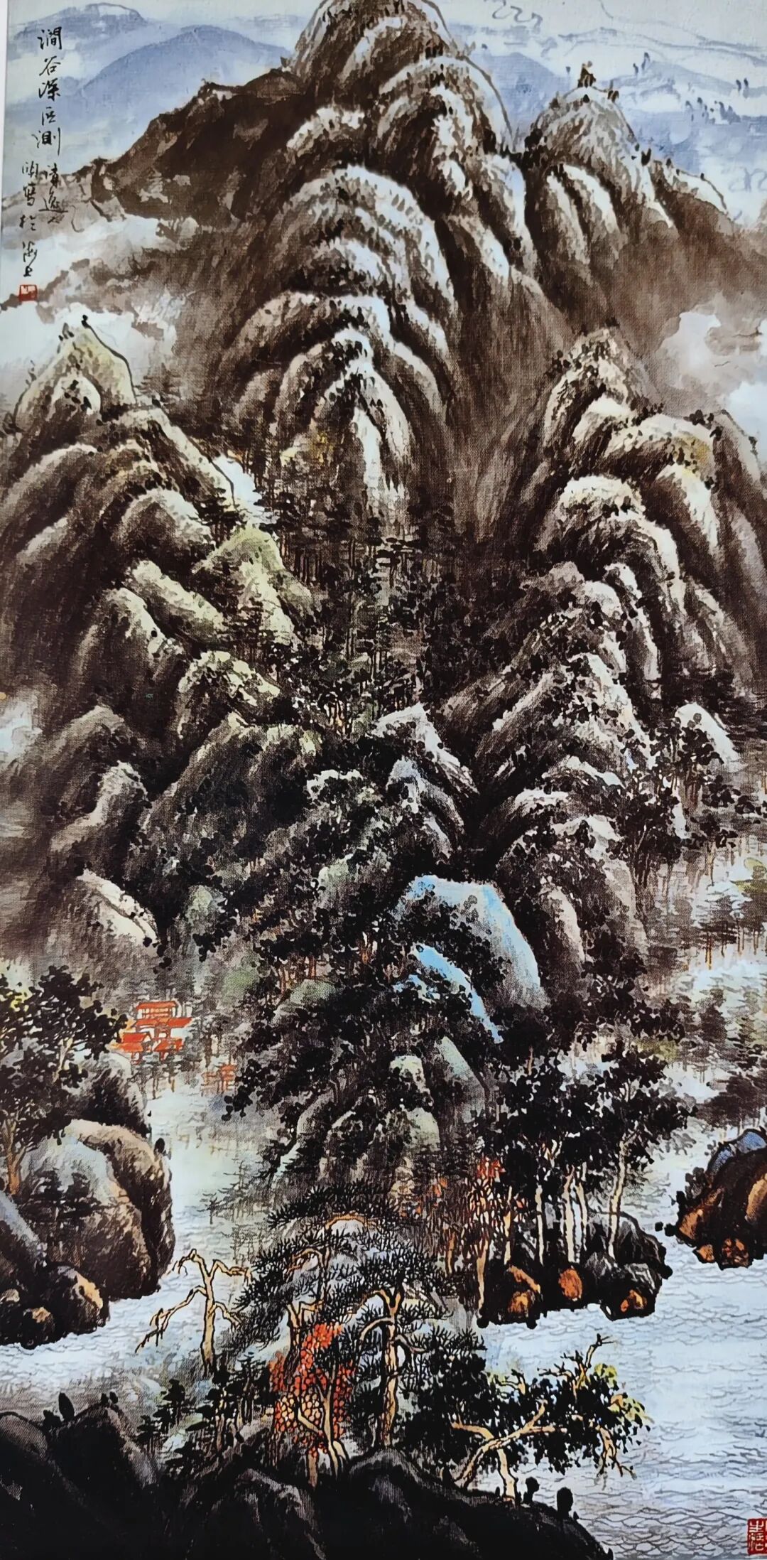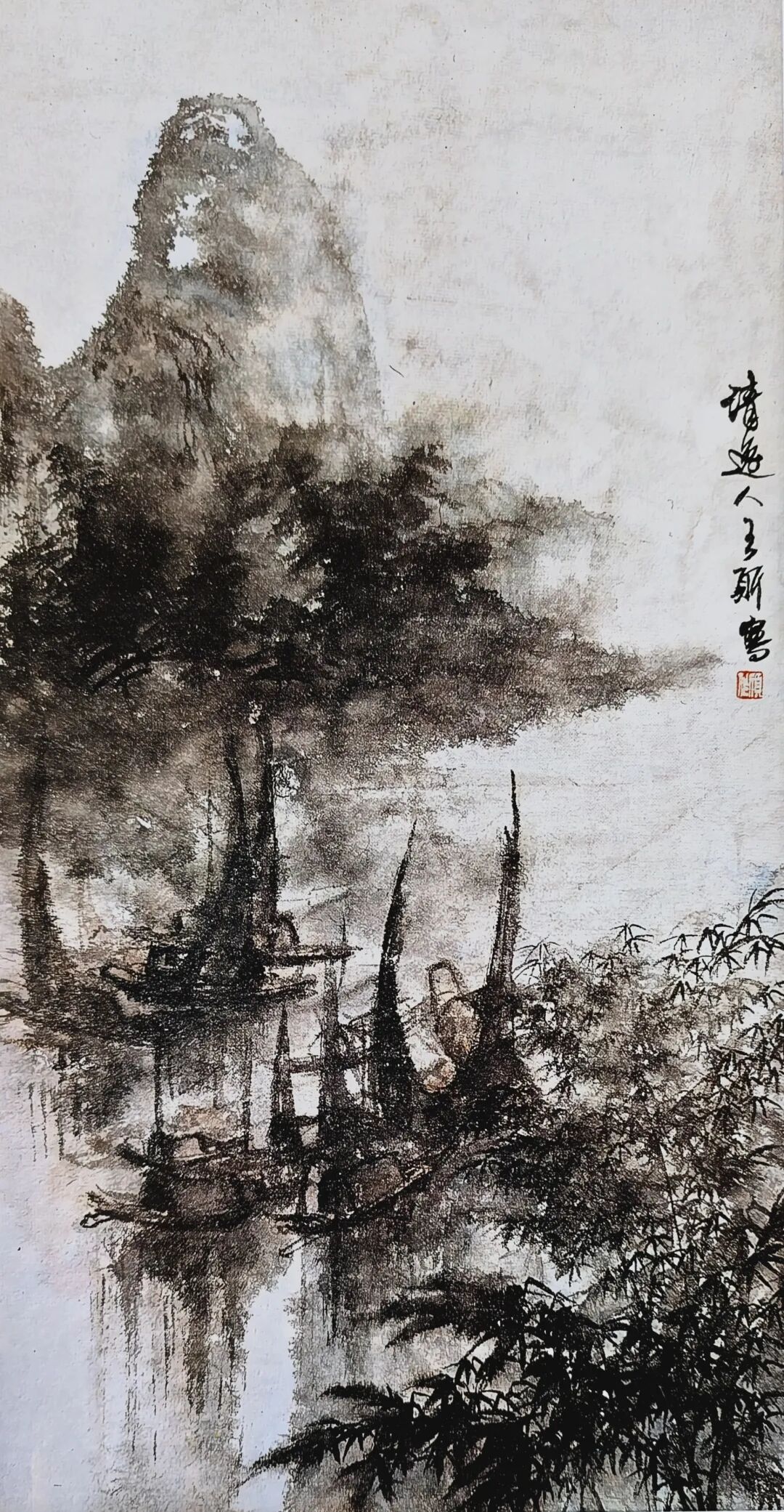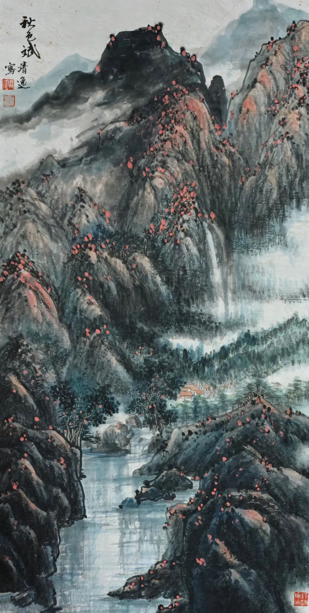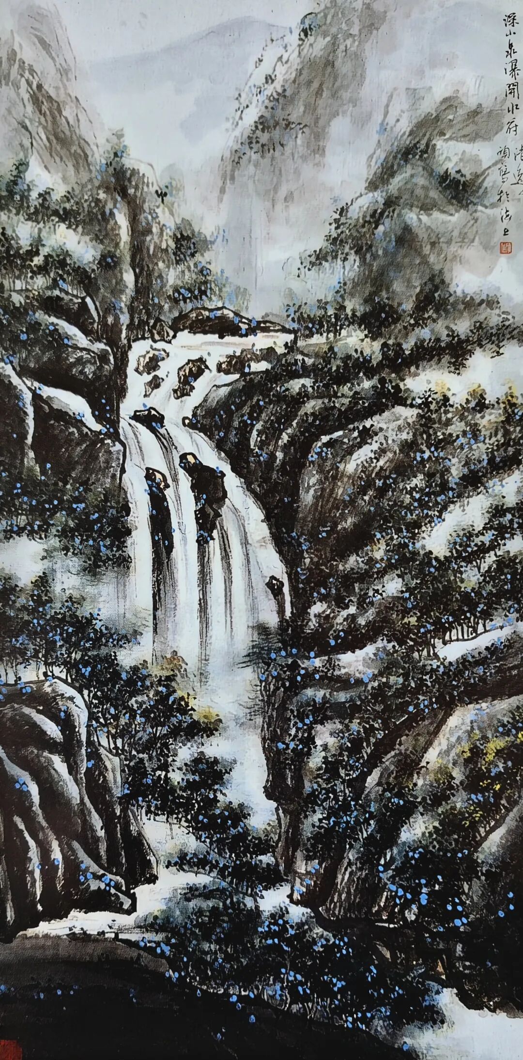 在色彩运用上,他展现了极高的艺术造诣。他通过对水墨的透与干湿变化的掌控,赋予了山水画作品丰富的层次感和生动的气氛。他常常运用湿笔渲染,营造出水光滟的效果;而在表现远山时,则多用干笔勾勒,使得画面既有远近的对比,又有空间的深度。他对色彩的灵活运用,使得每一幅作品都充满了生命力与动态感。