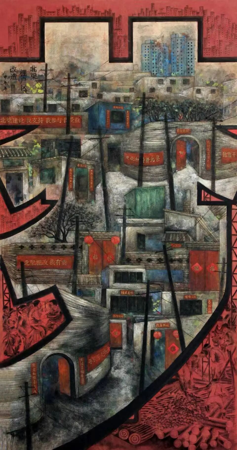 《北梁棚户区记忆》120X240cm 重彩岩彩 2012年