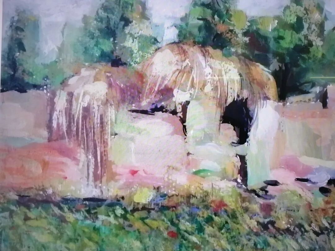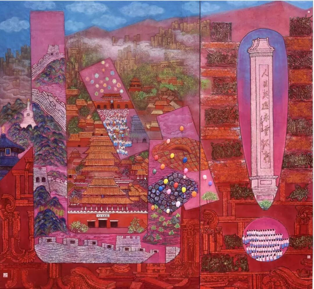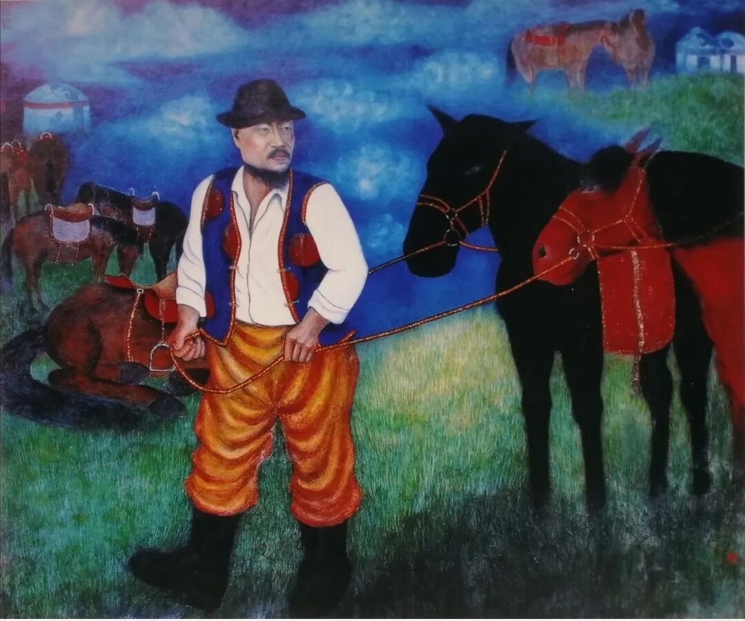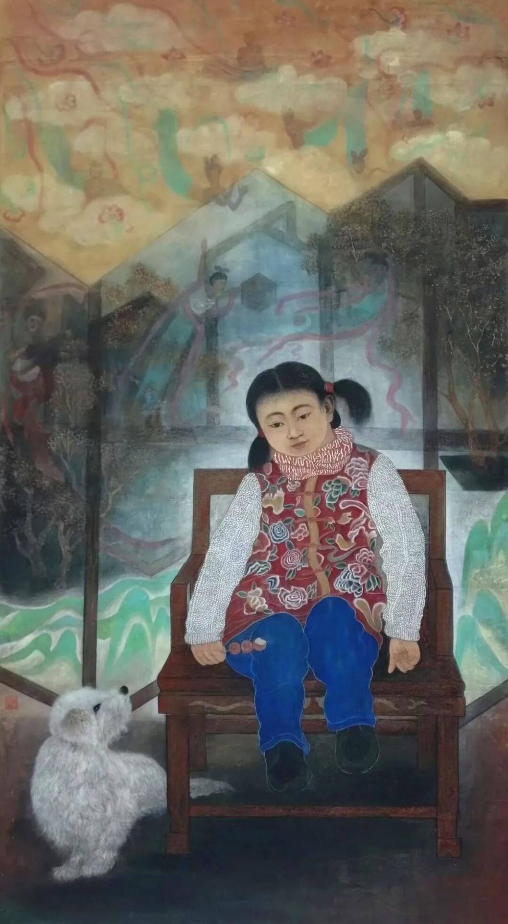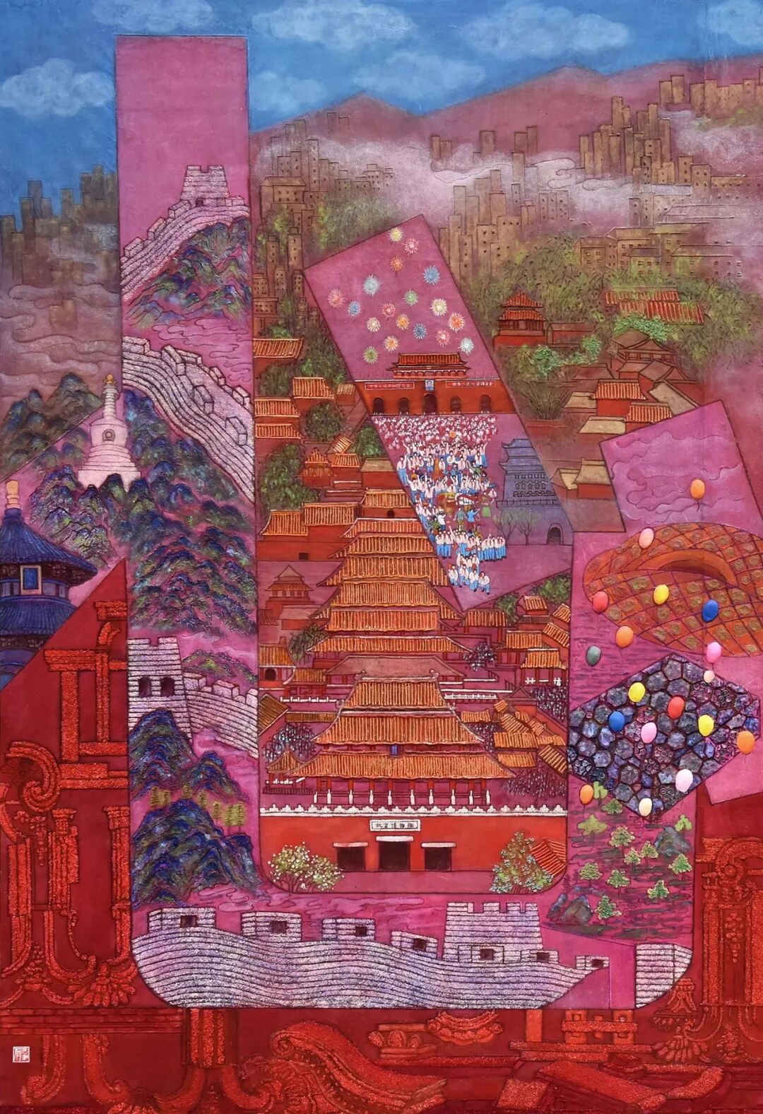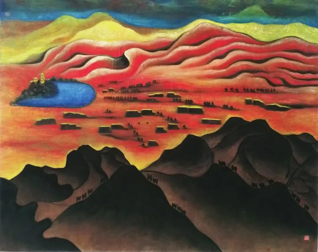 绘画特点立足本民族文化艺术,致力于探索研究中国画重彩画面貌:借鉴中西方文化艺术,融合发展多元化的符号语言,使得绘画风格在独幅作品中既有中国重彩画又有油画语言的韵味,根据画面需要采用矿物颜料、丙烯颜料等。近些年又在探索画面形式感语言的民族化及画面综合材料的运用,使得画面在平面的基础上产生立体感的艺术效果。本着融合中西方文化,传统与现代文化,民族与世界文化多元化的理念,大胆突破寻求新的绘画语言。教学期间辅导学生专业考取中央美院、中国美院、清华大学美术学院、西安美院、四川美院、广州美院等九大美院及复旦大学、西安交大、南京大学等985高校和国际意大利佛罗伦萨美院、英国伦敦艺术大学等。下面用十几幅重彩画创作从“民族情”“故乡情”两个方面表达自我生活阅历、情感及学术成果。