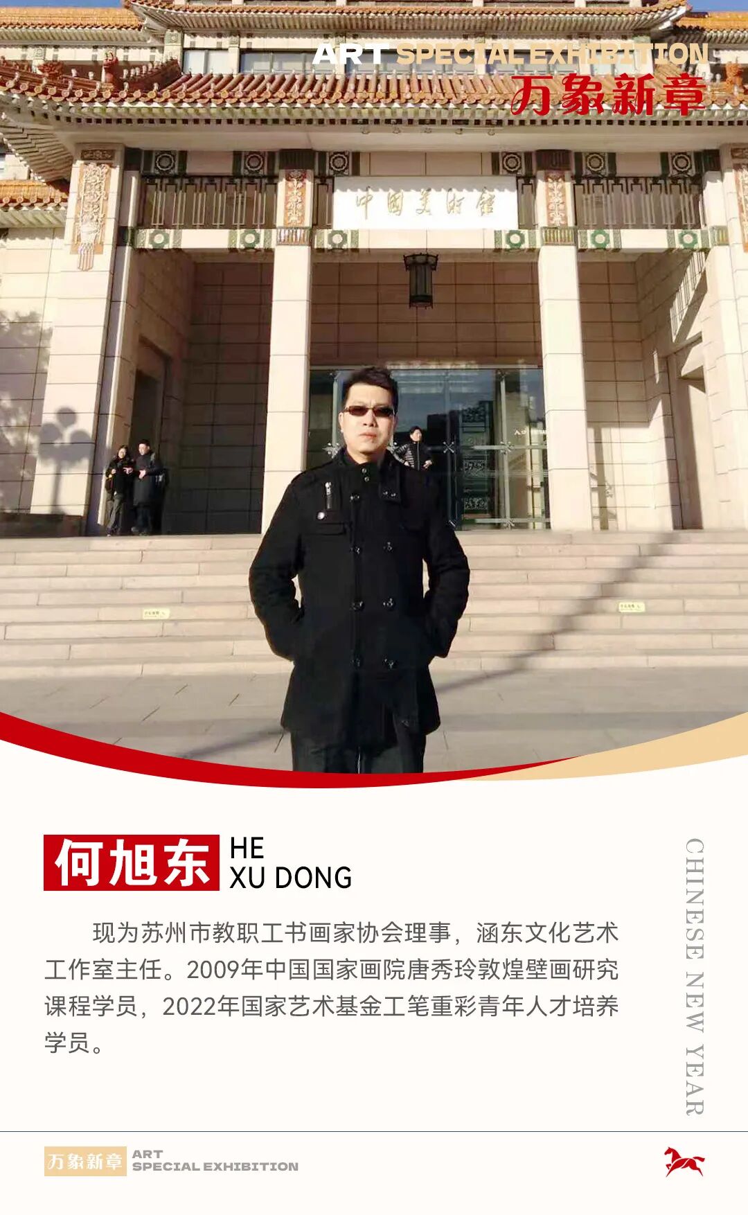 何旭东先后毕业于西安美术学院和武汉大学,获得学士和硕士学位。曾任教于泉州德化陶瓷学院,现为苏州市教职工书画家协会理事,涵东文化艺术工作室主任,苏州市美术家协会会员。2009年中国国家画院唐秀玲敦煌壁画研究课程学员,2022年国家艺术基金工笔重彩青年人才培养学员。曾为北京人民大会堂陕西厅合作绘制壁画《大唐丝路图》,《高原情》获第四届“民族情”全国书 画大赛银奖,《盛装》入选中国美术馆成立50 周年展览并收藏具有划时代性意义,《北梁棚户区记忆》入选陕西省美术博物馆全国第五届“高原·高原”中国画年度展,《高原情韵》获苏州市首届美术新人新作展优秀奖(最高奖)等。国家汉办派遣前往西班牙瓦伦西亚大学、马德里大学孔子学院教学并举办个人画展。人民美术出版 社出版《“群珍荟萃”全国十大美术馆藏品展作品集》。多篇论文在国家级、省级专业性期刊发表,多幅作品被陕西省美术博物馆、北京鲁迅博物馆等国家级和私人收藏。