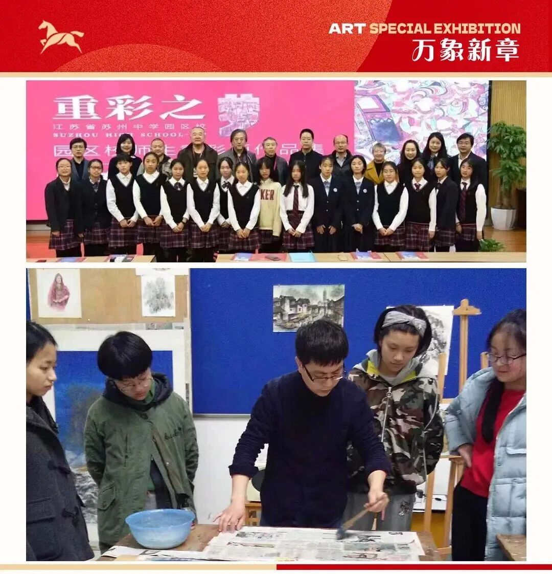 综上围绕重彩岩彩画进行学术研究、特色教学、展览育人等方面探究实践,其意义在于在青少年中普惠式策略教学,2019年敦煌艺术研究院侯黎明先生围绕敦煌学艺术讲座及出席苏州市美术馆师生重彩画展开幕式,应证了专业性重彩画理念教学在广大青少年普惠式教学中的重要意义。如今现状我国从古至今水墨艺术传承发展相对宽广,国际影响中唐代文化艺术博大精深源远流长,唐代艺术流芳百世的又以工笔重彩著称,由此可见传承、保护、发展我国重彩画艺术的重要意义及重彩画教学的重要性。由于历史种种原因唐宋后重彩画与水墨相比发展一度缓慢,传承发展我国重彩画艺术及对新时代岩彩画的更广泛性融合式教育理念实施:融合传统文化与现代文化、东方文化与西方文化、民族文化与世界文化探索空间宽广。一代代有识之士及美育教育工作者,应当把我国优秀文化艺术结合时代性更加全面地传承好发展好!现实中普通高校有着相对完善的艺术教学体系,而在中学或高职院校课堂中略显断层;从学习的黄金期而言,广大青少年更是学习文化、艺术打牢基础的大好时机,教育部提出“五育并举”素质教育的国策,美育教育围绕重彩岩彩画的理念实践教学,既有号召性又有前瞻性,根植于重彩岩彩画特色,以广大青少年为基石普惠式教育教学其意义深刻而任重道远!