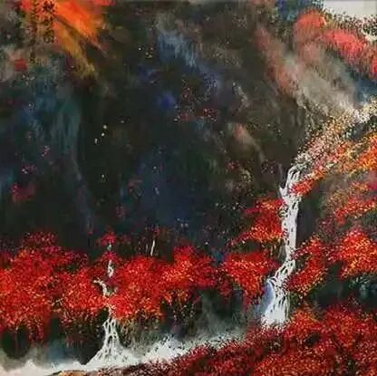 【秋彤图】国画泼彩山水作品,规格:69cmx68cm四尺斗方(四平尺)
