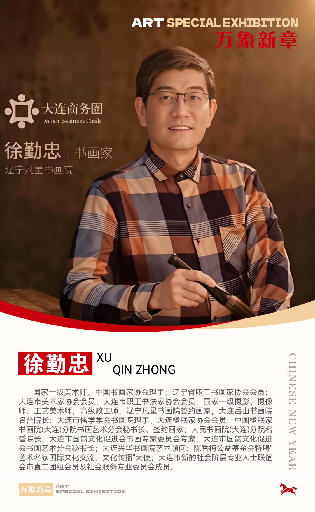 徐勤忠 字:长乐,别署:颐和斋主人,自幼习画,从事美工、宣教工作四十余载,大学工艺美术包装装璜专业毕业。国家一级美术师、中国书画家协会理事;辽宁省职工书画家协会会员;大连市美术家协会会员;大连市职工书法家协会会员;国家一级摄影、摄像师、工艺美术师;高级政工师;辽宁凡星书画院签约画家;大连岳山书画院名誉院长;大连市儒学学会书画院理事、大连楹联家协会会员;中国楹联家书画院(大连)分院书画艺术分会秘书长、签约画家;人民书画院(大连)分院名誉院长;大连市国韵文化促进会书画专家委员会专家;大连市国韵文化促进会书画艺术分会秘书长;大连兴华书画院艺术顾问;陈香梅公益基金会特聘"艺术名家国际文化交流、文化传播"大使;大连市新的社会阶层专业人士联谊会市直二团组会员及社会服务专业委员会成员。现已退休,职业从事书画作品的创作、活动和私人订制。