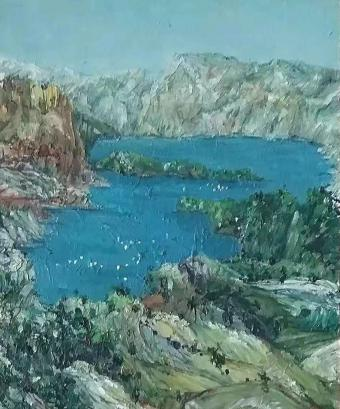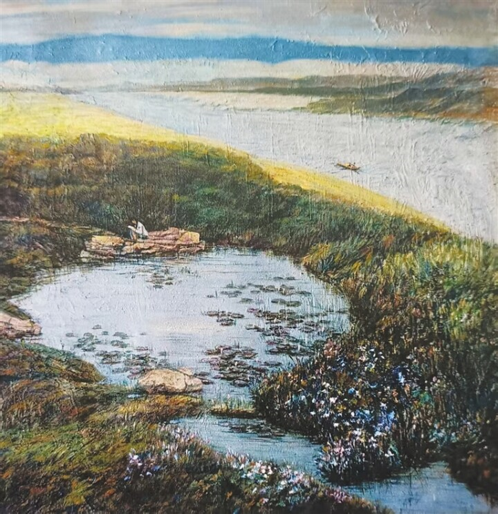 画家陈朝瑄生于重庆市潼南区柏梓镇,那是一座藏着岁月余温的古老小镇。 一次偶然的机缘,我与友人同访朝暄故乡居所,入门便见一幅《故乡秋水》油画悬于壁上,潼南的灵秀风光铺展眼前。画中那似曾相识的景致,轻易便唤起了我心底的乡愁——澄澈天光、漫卷白云,远山含黛、氤氲如雾,金黄稻田铺陈旷野,一方荷塘静卧其间,清幽自守。这让我想起,我的家乡也有这样一汪水草丰茂的荷塘,晴和之日,我总携一卷书独赴塘边,在草木清香中沉潜文字世界。画中,石上静坐的少女眉眼间的安然、惬意与淡淡孤寂,恰如我青春时的剪影。
