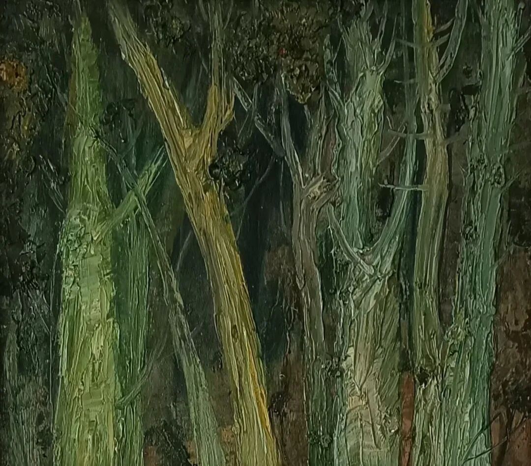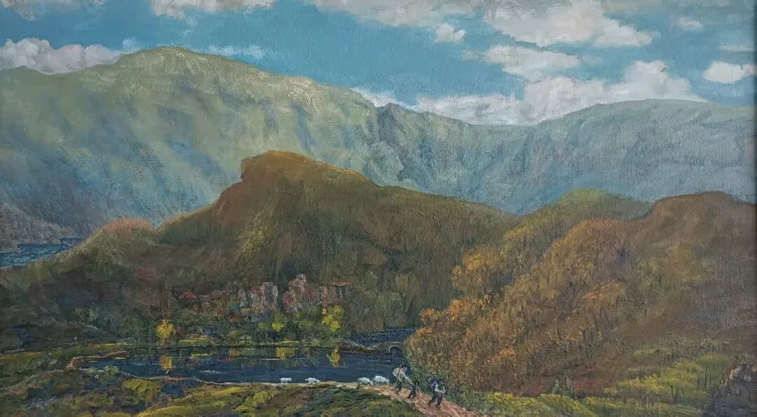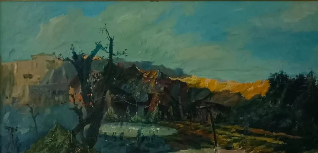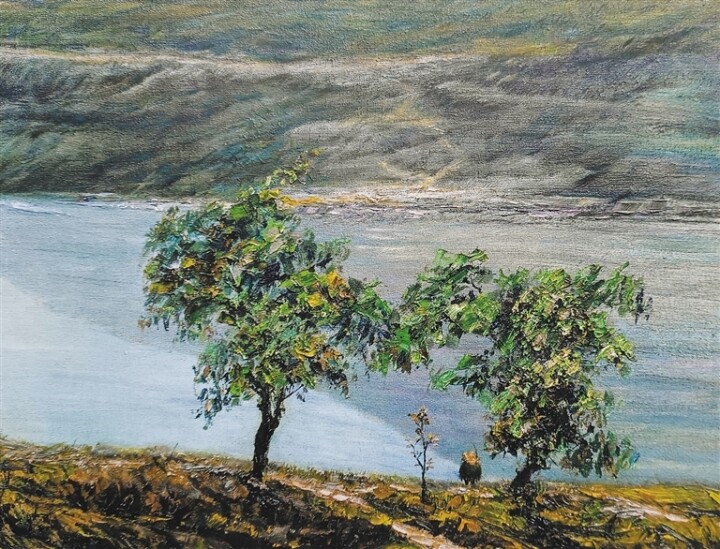 《瓊江畔》是另一幅描摹故鄉的佳作,全幅以灰藍色調鋪陳,隔河的山坡、通幽的小徑,皆透着静谧悠遠的氣息。河畔之上,一位戴着草帽的老者静坐垂钓,身後两棵老樹默然伫立,人與樹相伴、樹與樹相依,微風拂過,枝葉輕摇,漾起細碎的光影。我偏愛這般深沉凝重的色彩,恰如畫家歷經歲月沉澱後的心境——步入從心所欲的年紀,筆下畫作皆带着時光的質感與生活的滄桑,沉澱出獨有的韵致,数十年如一日對繪畫的堅守, 皆被陳朝瑄毫無保留地傾注于畫布之上,讓每一幅作品都成爲生命的注脚。