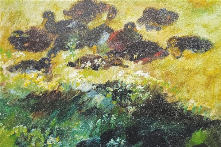 油畫《温吞地》中,陳朝瑄將一群雛鴨置于柔暖的鵝黄色調中,灰褐色的絨毛與沉鬱的草叢相融,凝成一團團靈動的色塊。憨態可掬的小生靈們,或隱于花間、或嬉戲玩鬧、或蜷卧打盹,情態盡顯生機。