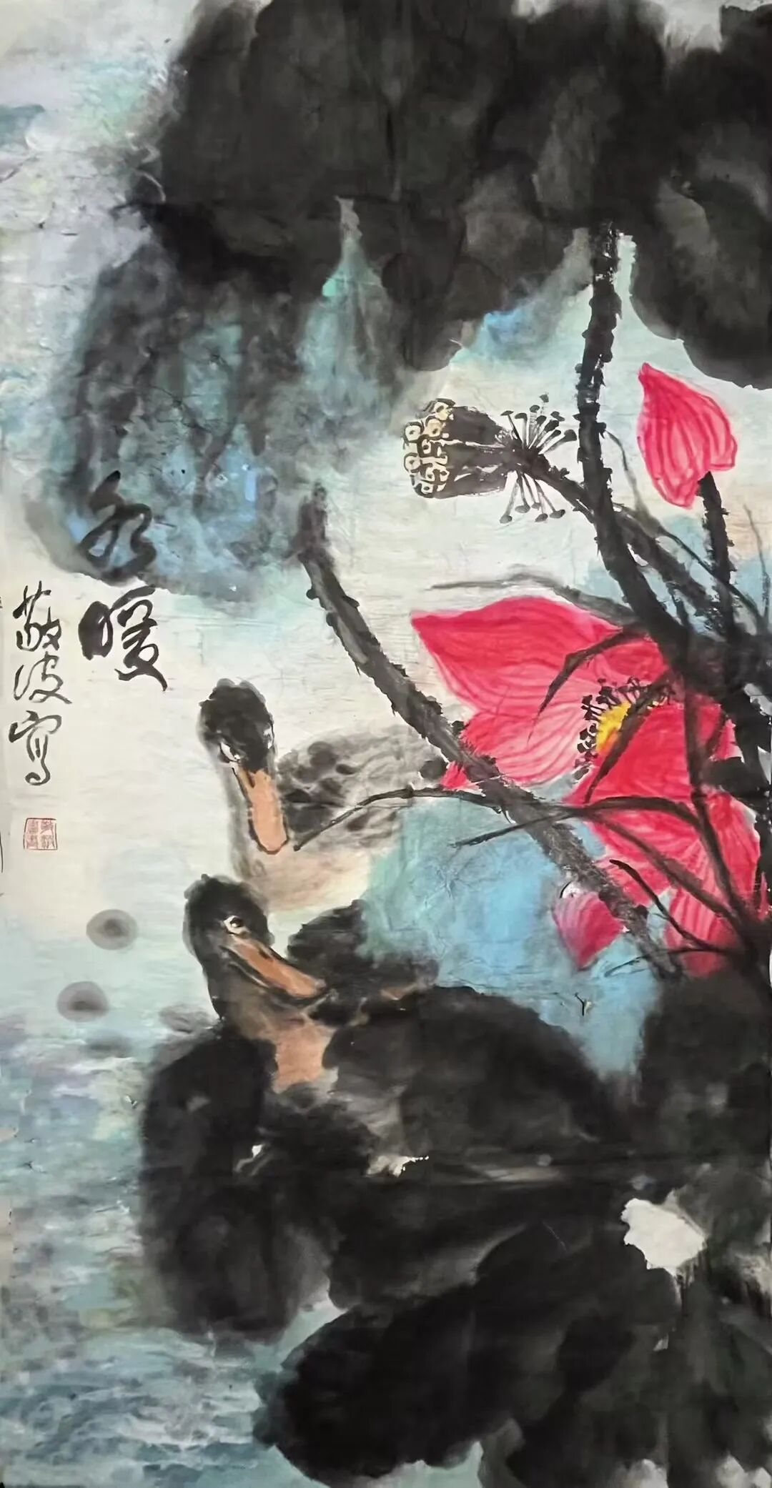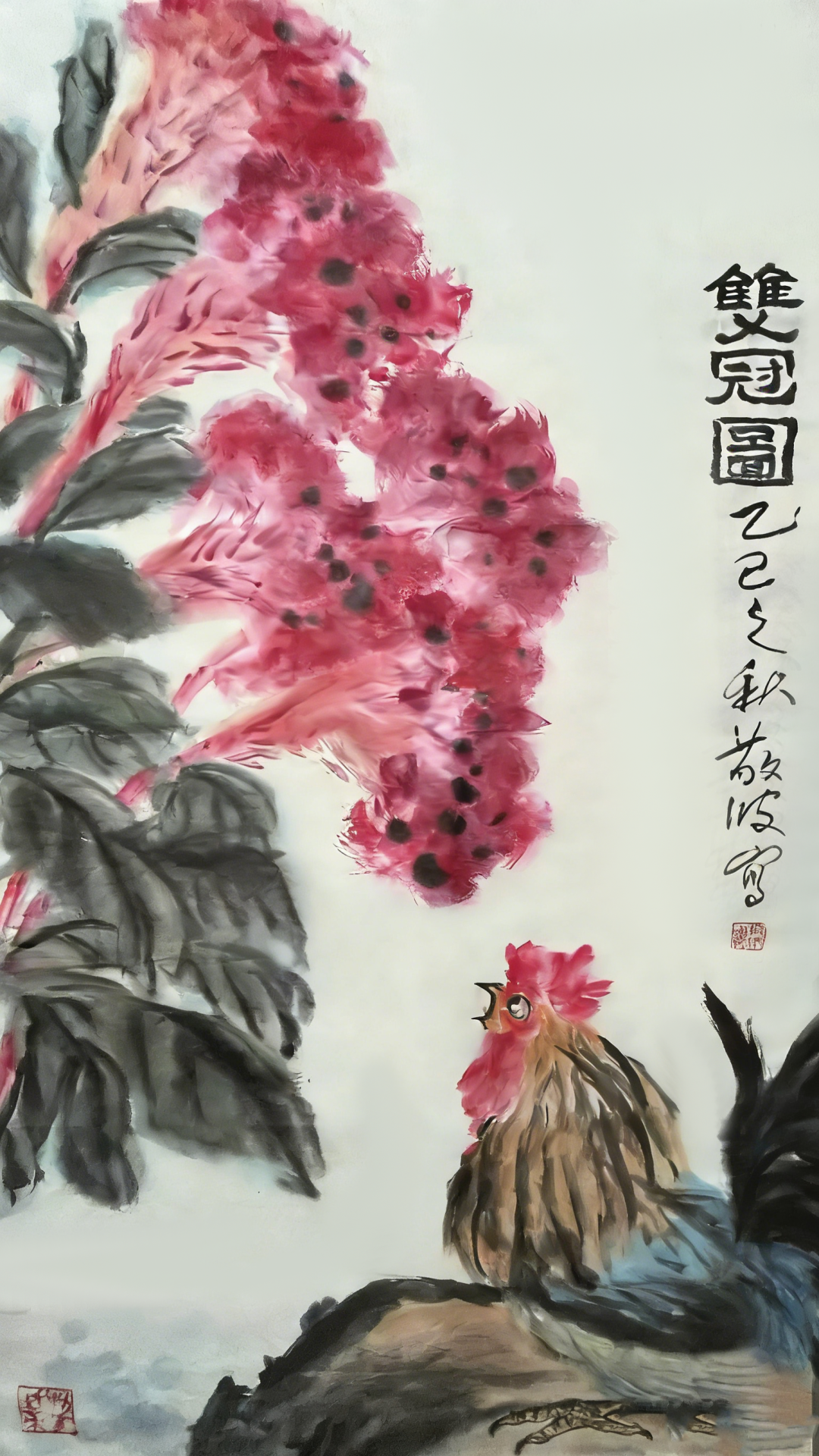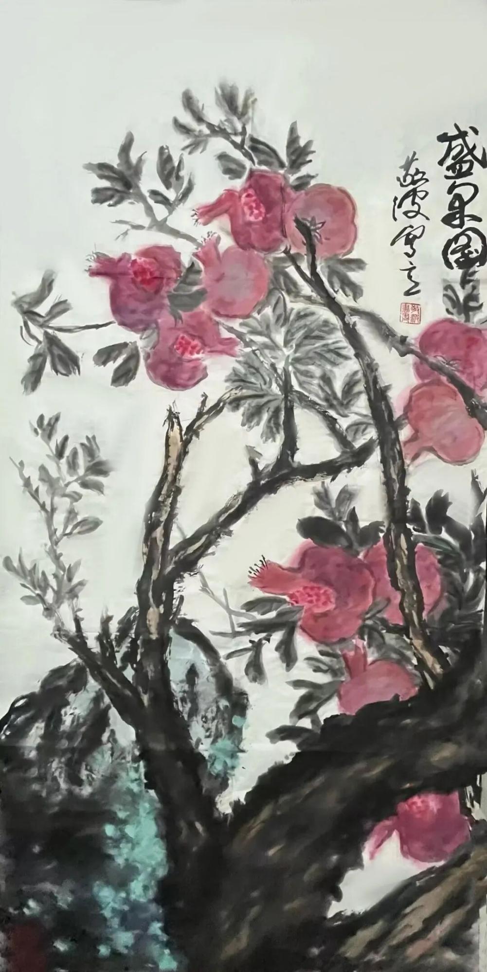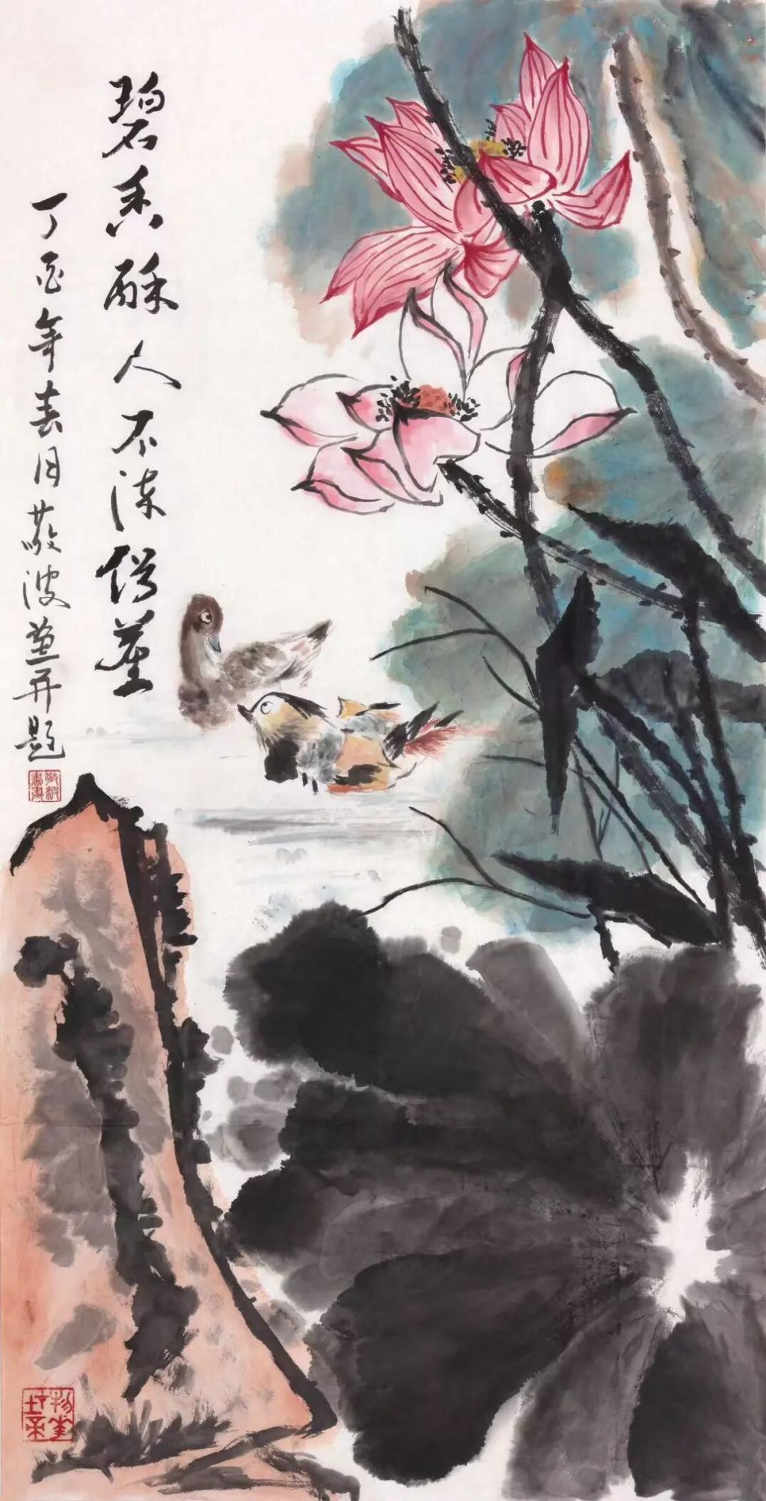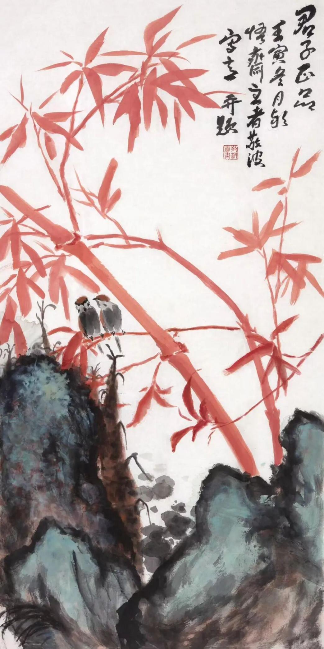 王敬波的写意花鸟画,观之格调扑实沉稳高雅,笔墨浑厚生辣,郁勃沉雄,线条流畅又具风骨。画面水墨交融、色墨辉映。构图讲究起承开阖,松紧有致,布局巧妙,气势宏阔,充满着健康向上、朝气蓬勃的气象。既可见传统功底,又展现时代风貌。这不仅是画家扎实基本功的体现,更是画家文化修养和精神状态的反映。