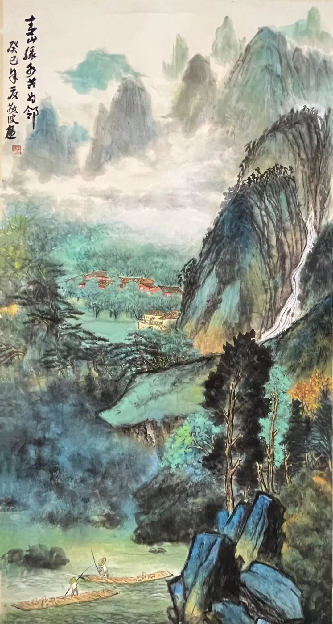 他对 “青绿” 的运用是作品鲜明标识:不同于传统青绿的浓艳厚重,其笔下青绿多了清润与通透 —— 浅绿、淡青铺陈山峦,间杂赭石、墨黑提亮层次,既保留古典雅韵,又以浅淡色调契合当代审美的 “轻逸感”;林麓、水域的青绿晕染,常裹着朦胧雾气,让山水浸在烟雨中,弱化装饰性、强化氛围感,达成 “雅俗共生” 的色彩平衡。