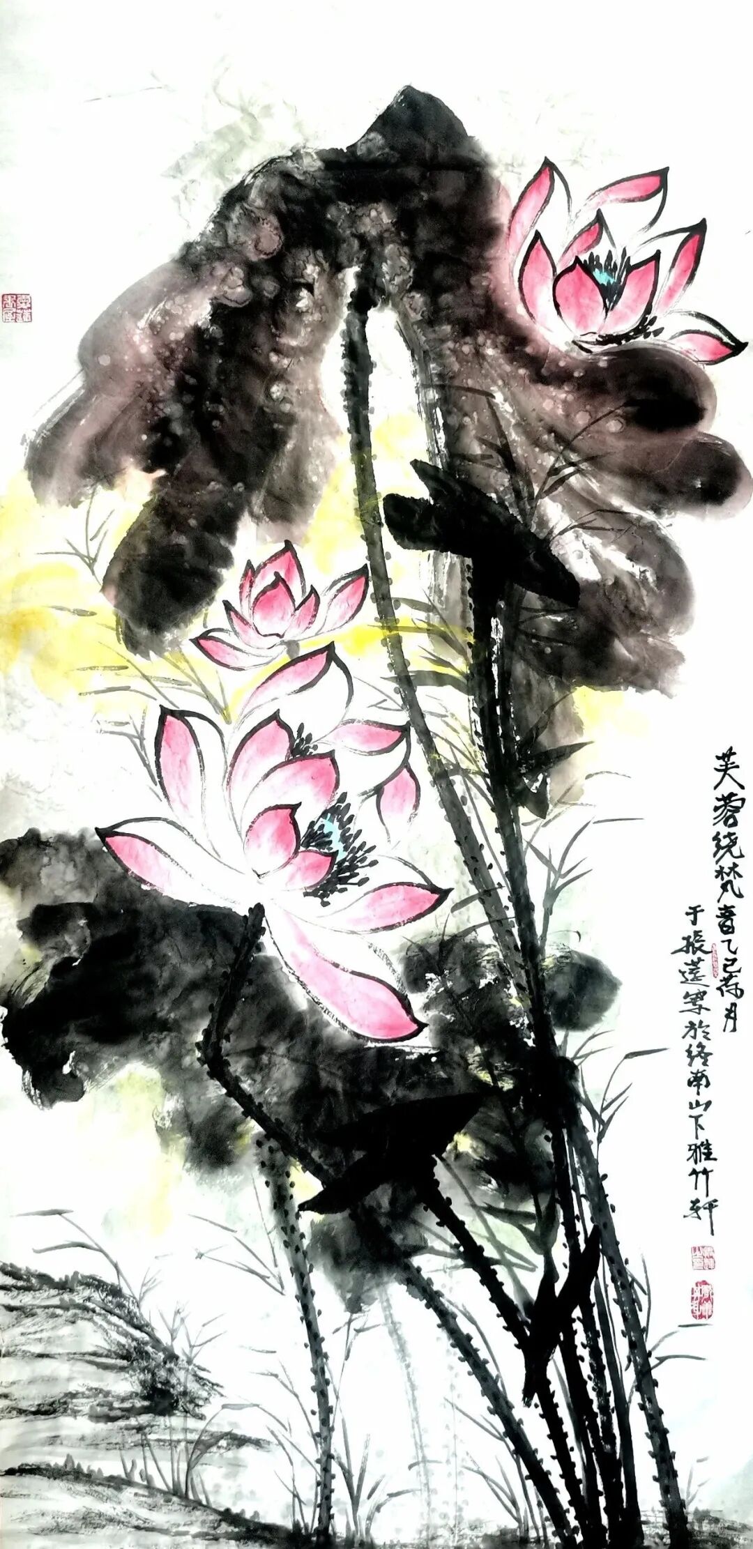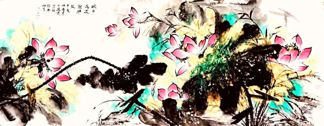 画荷是于振莲国画作品的一个亮点,更是她的文化符号。于振莲笔下之荷,有种清清池水边凭栏四顾的感觉。但见那满池青翠,或傲然出尘,或顾盼着,如语如诉;或恣肆如瀑布式的倾泻于丽日朗照之下;或轻盈地飘摇在清风中,其墨叶,浓的蓊然沉郁,淡的洒然飘逸,浓浓淡淡间,纯粹得恍若天地鸿蒙,中锋粗壮而不涩滞,侧锋空灵而不枯扁,亭亭的荷茎和荷芰生机勃勃地滋长蔓延着,支撑着生命的绚烂绽放。粉黛出水.天生丽质似亭亭玉立的仙子在碧波中美目流盼。草下游动的小鱼.掠过水面的蜻蜓.微风骤起,掀起一片绿浪,送来阵阵荷香……
