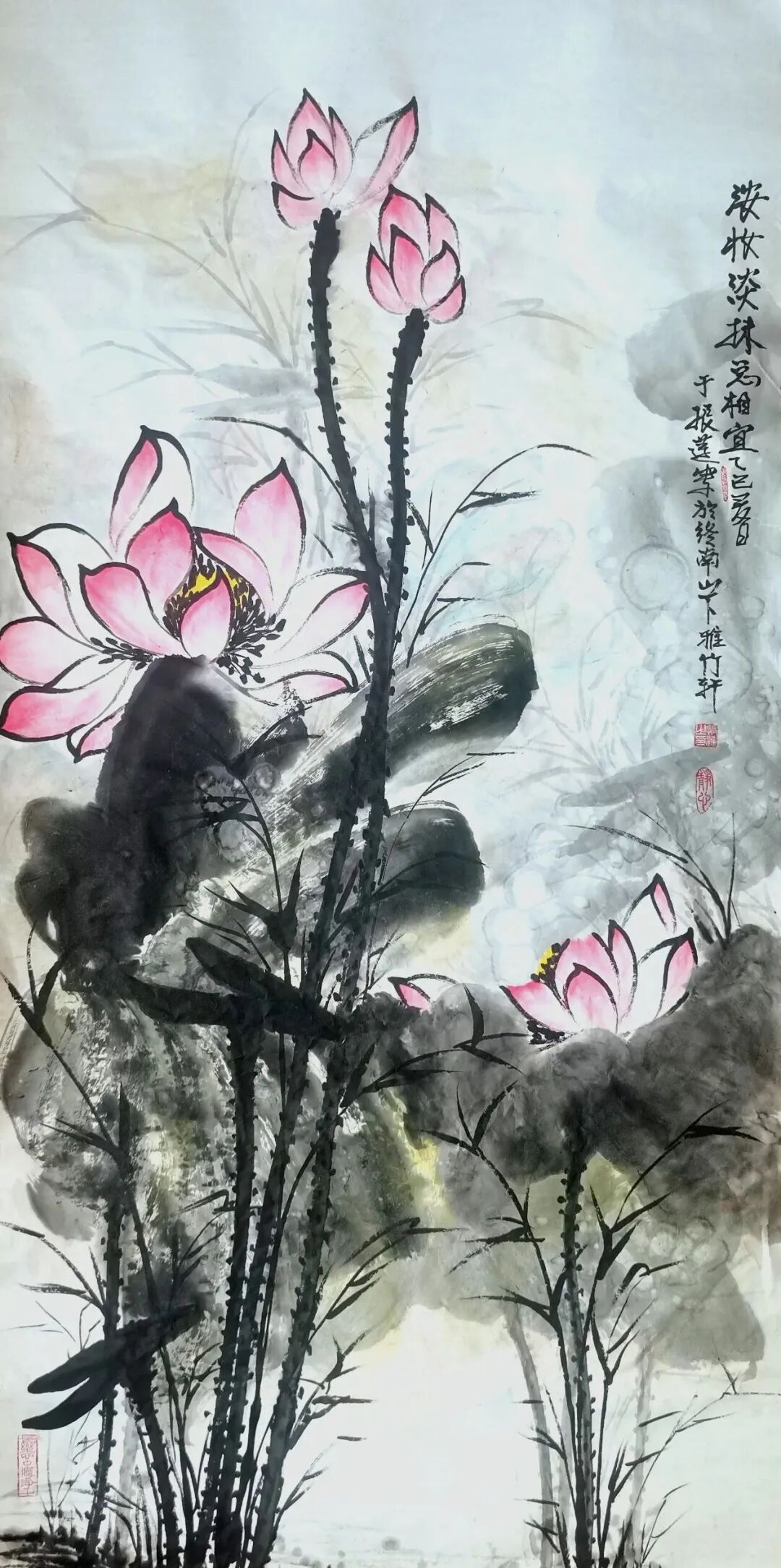 水是一切生命的源泉,荷花也因水而生。无论在理念上还是技法上,于振莲都把用水提升到极重要的位置。“水晕墨彰”,她往往以饱含水分并掌握适度的笔墨,或勾或染,或泼或积,笔随心运,水到图成,或淡而透明,或浓而光泽,或墨彩交融,恰到好处地营造出荷花变化多姿的形态神韵,创造出发人沉思的生命诗境。随机生发的肌理效果,越发增加了水墨艺术的情趣性。水乡之魂,水气氤氲,荷花的柔而润,刚而清,都在水的韵味中发挥得淋漓尽致。于振莲画荷,淡雅而不淡出,自然而不造作,灵动而不拘泥,内秀而不张扬,形成了自己的水墨语言、艺术个性、文化符号和人文特征。她的荷花,有章有法,有声有色,在动态中弥散着安宁,在美育中播撒着和谐。在淡雅中见玄览,在含蓄中见诗意,在平和中见江南。