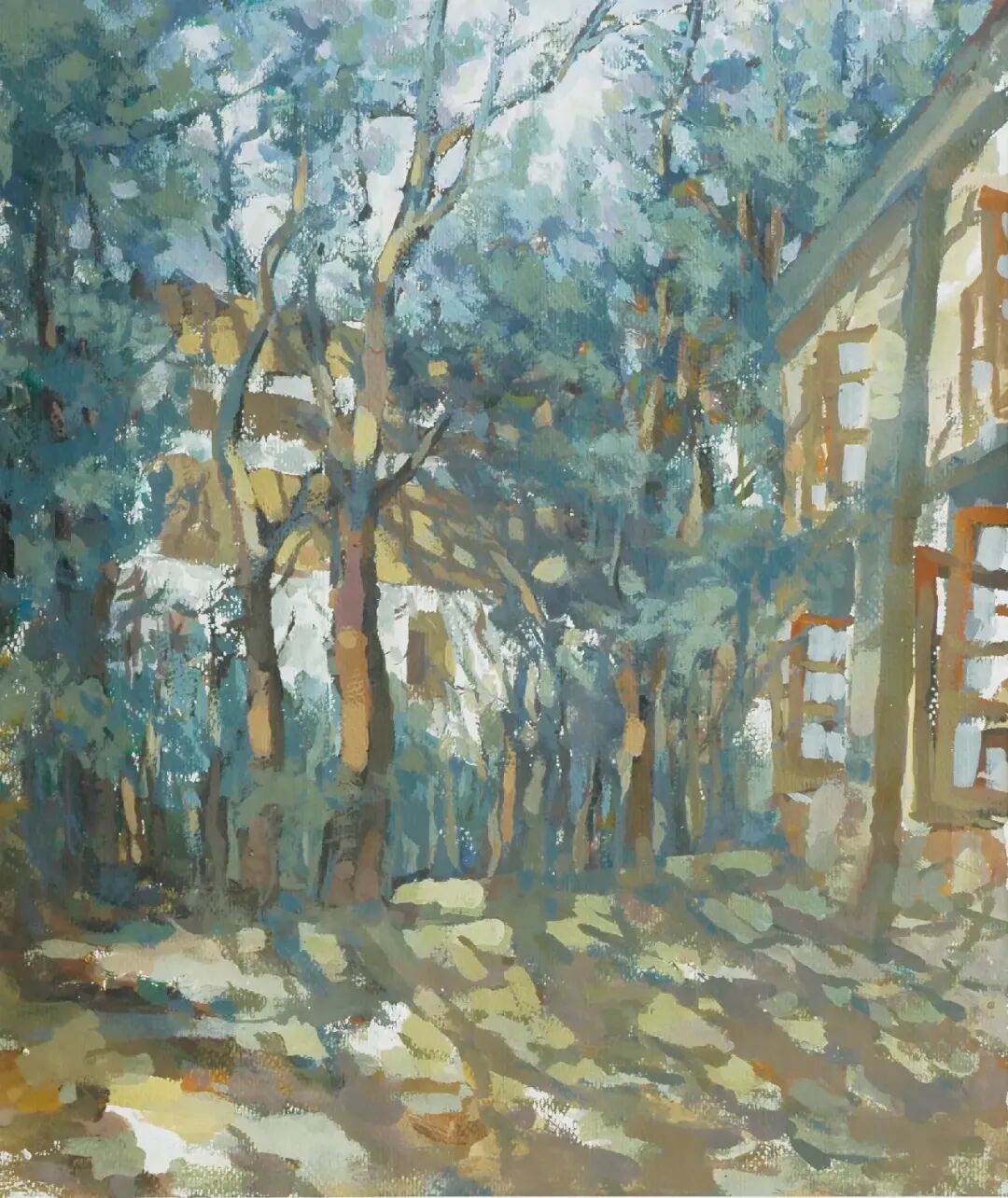 注重阳光与颜色的色彩关系,跳跃的阳光和斑斓的颜色使画面生机勃勃,明媚的光影效果,是印象派的表象,我也喜欢用水粉表现这种光影的感觉。我常常在写生时,能感受到景物在阳光的照射下,产生无穷的明暗冷暖色调,尤其在暗部透着阳光和空气相融的微妙的冷暖色彩关系,使我的画笔很难停下,眼前所呈现的色彩极其丰富,我尽情地表现景物投影中的暗部冷色偏暖的颜色,所谓的空间感也就在此吧……