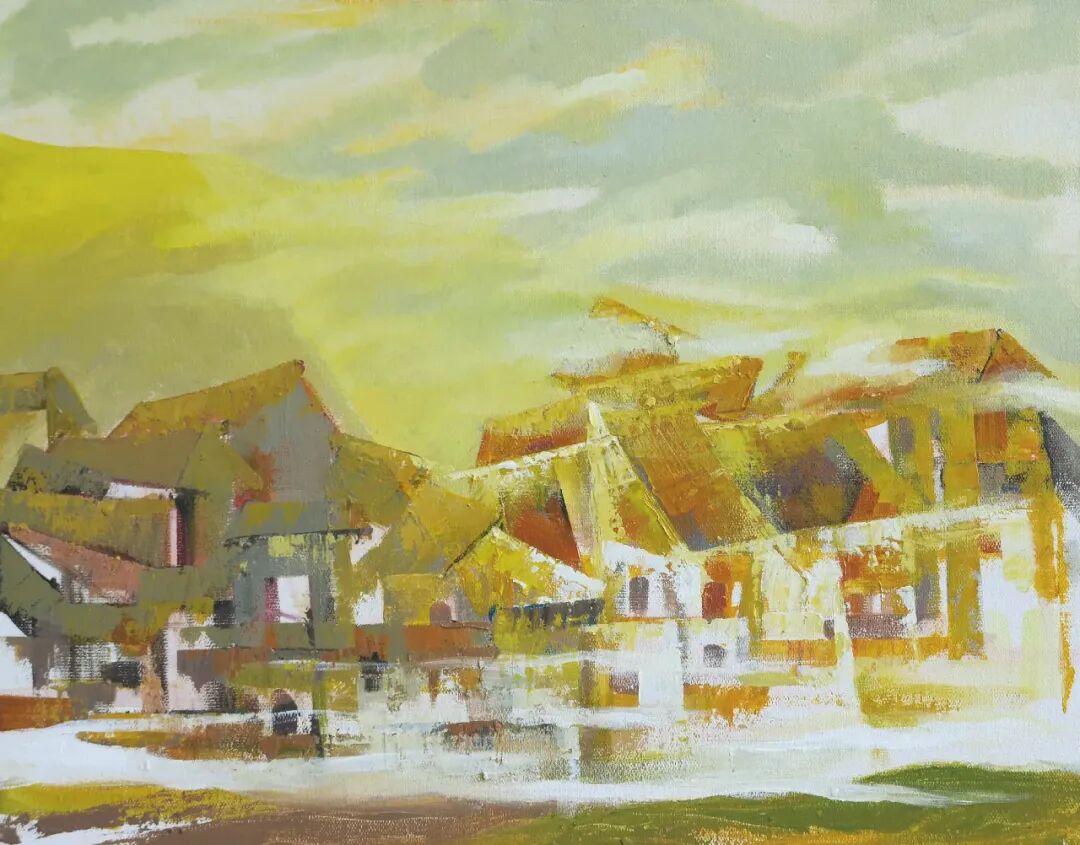 用丙烯颜色写生,可薄可厚,我常常喜欢在丙烯颜料里加点水粉颜料,使它产生化学反应,如同油画塑形膏,不带光泽,直接用刮刀像抹墙一样,抹在画面上,很是过瘾!也能表现出景物的质感,油画刀是我爱用的一支笔。