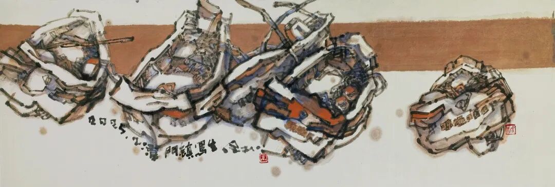 《舟楫系列》也是我近年创作的主题。探寻了多方的渔村、海港,在海南的潭门镇等渔港,发现了契合我对“渡心之舟”美学意象追寻的渔舟。